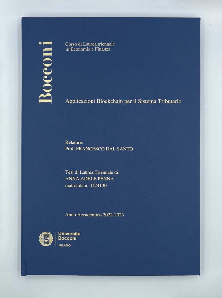 Il contrasto tra il blu della copertina Tela e l’oro della scritta crea un effetto visivo elegante e armonioso, perfetto per una tesi destinata a rappresentare un percorso accademico di eccellenza come quello dell’Università Bocconi di Milano. L’oro, simbolo di successo, valore e ambizione, rafforza il significato della tesi come oggetto di rappresentanza.