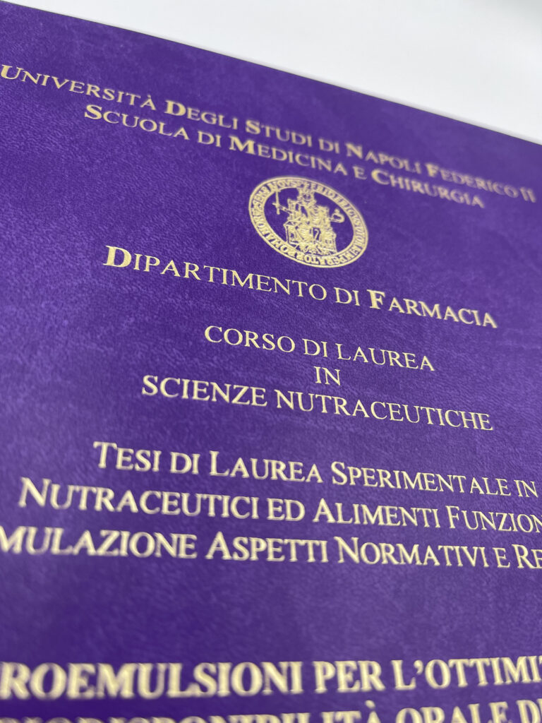 Per una nostra cliente dell’Università degli Studi di Napoli Federico II, impegnata nella realizzazione della propria Tesi di Laurea Sperimentale in Scienze Nutraceutiche, abbiamo realizzato un elaborato elegante, resistente e altamente personalizzato, studiato in ogni dettaglio per valorizzare al massimo il percorso accademico svolto negli anni universitari. La tesi non è solo un documento scritto: rappresenta la sintesi di un lungo impegno, il traguardo finale di studio, ricerca, sacrificio e soddisfazioni personali. Per questo motivo abbiamo dedicato particolare attenzione alla scelta dei materiali, delle tecniche di stampa e delle soluzioni di rilegatura, affinché il risultato finale fosse all’altezza di un momento così importante.